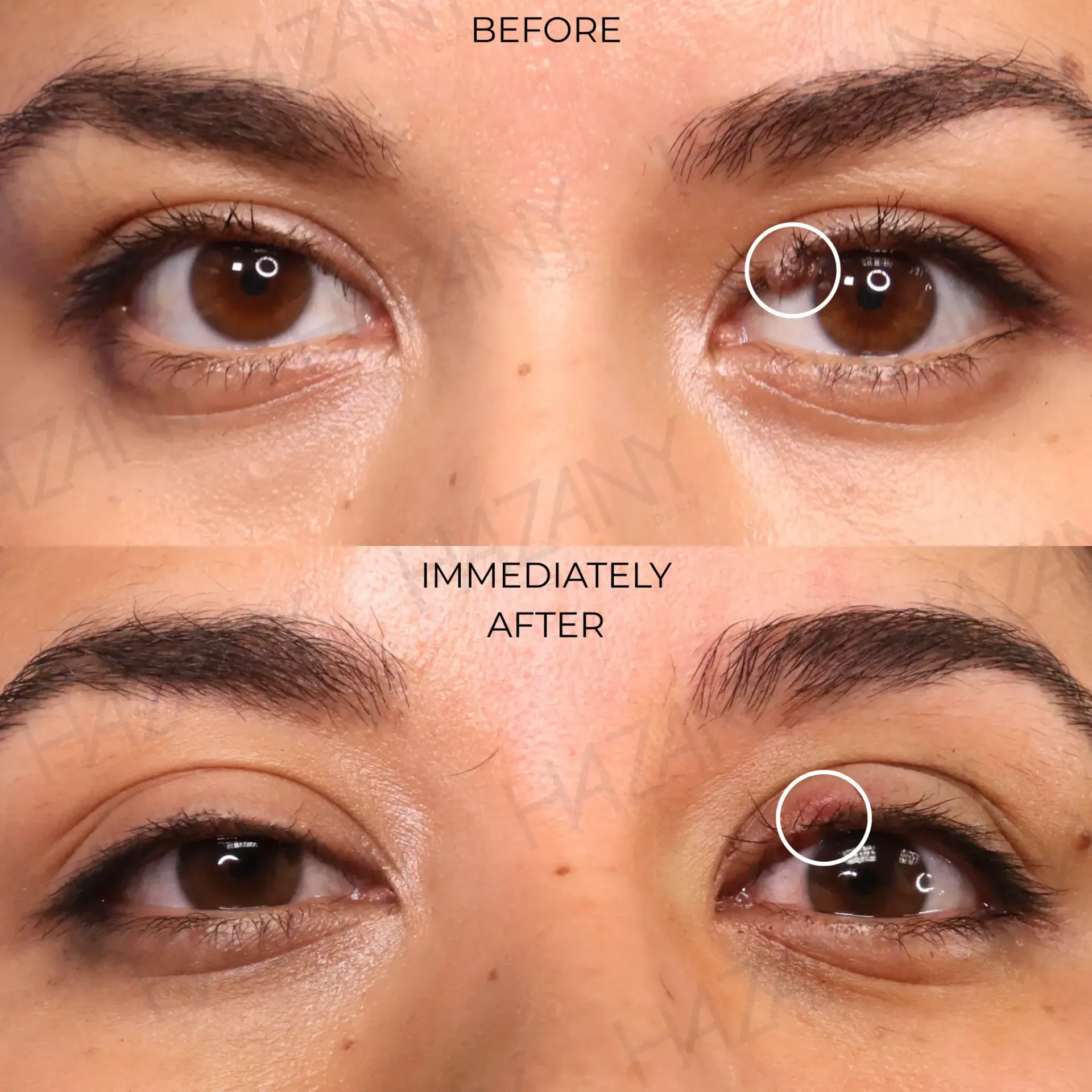 Eyelid nevi, or eyelid moles, are usually benign lesions that can appear along the lash line, upper lid, or lower lid. These lesions are formed when melanocytes, the cells responsible for pigment production, grow in a cluster. These moles are most commonly caused by sun exposure, genetic predisposition, aging, and skin changes. They can commonly be identified by darker pigmentation or more raised texture compared to the surrounding tissue. Most moles are harmless, but many seek mole removal for hindrance to their vision, health concern, or cosmetics. The eyelid is a sensitive, delicate location, and precise technique must be applied to ensure safe removal and a result with minimal scarring.