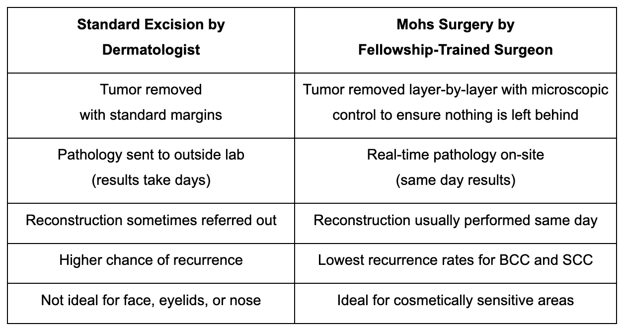 Skin cancer is an unfortunate reality that 1 in 5 Americans will confront in their lifetime. It’s a frightening battle but it’s one we must meet with action and awareness. This is why seeing a Mohs surgeon is a necessity for getting the most effective treatment available.While board certification is important, it doesn’t guarantee the highest level of surgical skill and expertise for skin cancer removal, especially in delicate, cosmetically sensitive areas like the face, nose, or eyelid. This is where fellowship training in Mohs surgery makes a big difference.This article will explore what Mohs micrographic surgery is, why it offers the highest cure rate for basal cell carcinoma and squamous cell carcinoma, and why choosing a fellowship-trained Mohs micrographic surgeon over a standard board-certified dermatologist is critical for the best cosmetic and surgical outcomes.